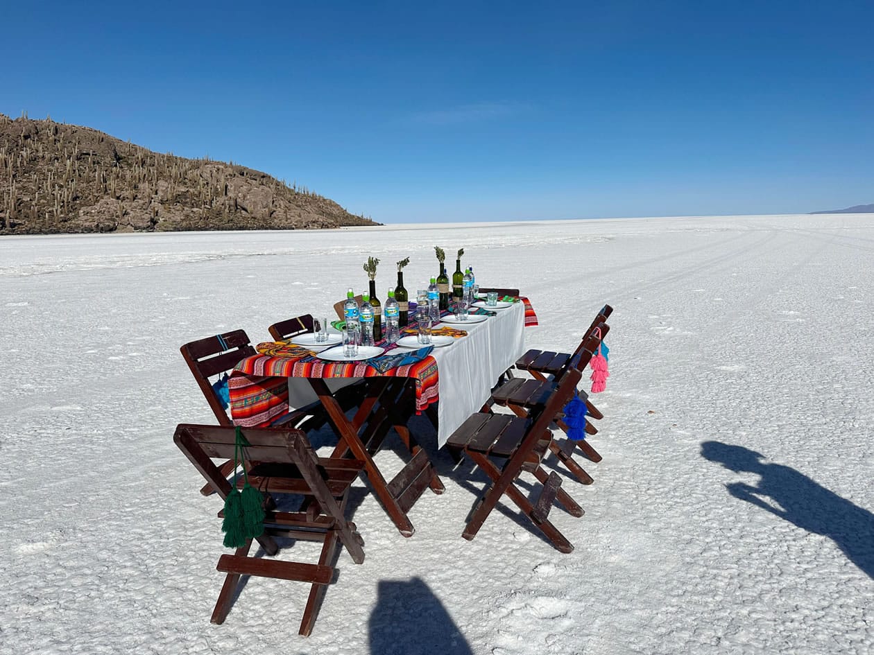 Recojo del aeropuerto o estación de bus y visita al cementerio de trenes, planta artesanal de procesamiento de sal el pueblo en Colchani. Almuerzo en medio del Salar. Excursión a la Isla Incahuasi situada en el centro del Salar y poblada de cactus gigantes. Al final de la tarde se podrá apreciar un espectacular atardecer. Retorno a Colchani o a Uyuni.